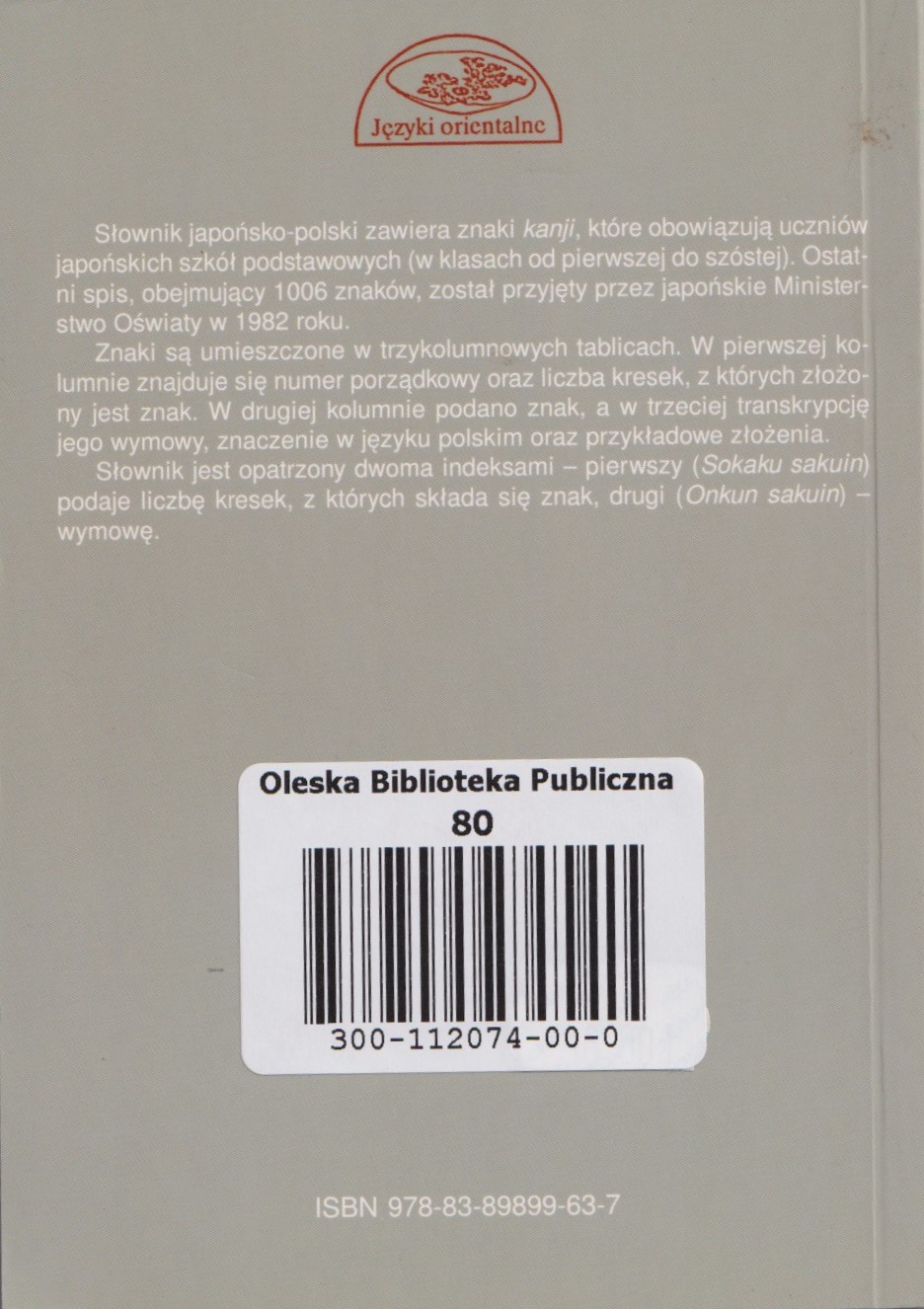 Słownik japońsko-polski zawiera znaki kanji, które obowiązują uczniów japońskich szkół podstawowych (w klasach od pierwszej do szóstej). Spis, obejmujący 1006 znaków, został przyjęty przez japońskie Ministerstwo Oświaty w 1982 roku. Znaki są umieszczone w trzykolumnowych tablicach. W pierwszej kolumnie znajduje się numer porządkowy oraz liczba kresek, z których złożony jest znak. W drugiej kolumnie podano znak, a w trzeciej transkrypcję jego wymowy, znaczenie w języku polskim oraz przykładowe złożenia. Słownik jest opatrzony dwoma indeksami - pierwszy (Sokaku sakuin) podaje liczbę kresek, z których składa się znak, drugi (Onkun sakuin) - wymowę. (Z okładki).