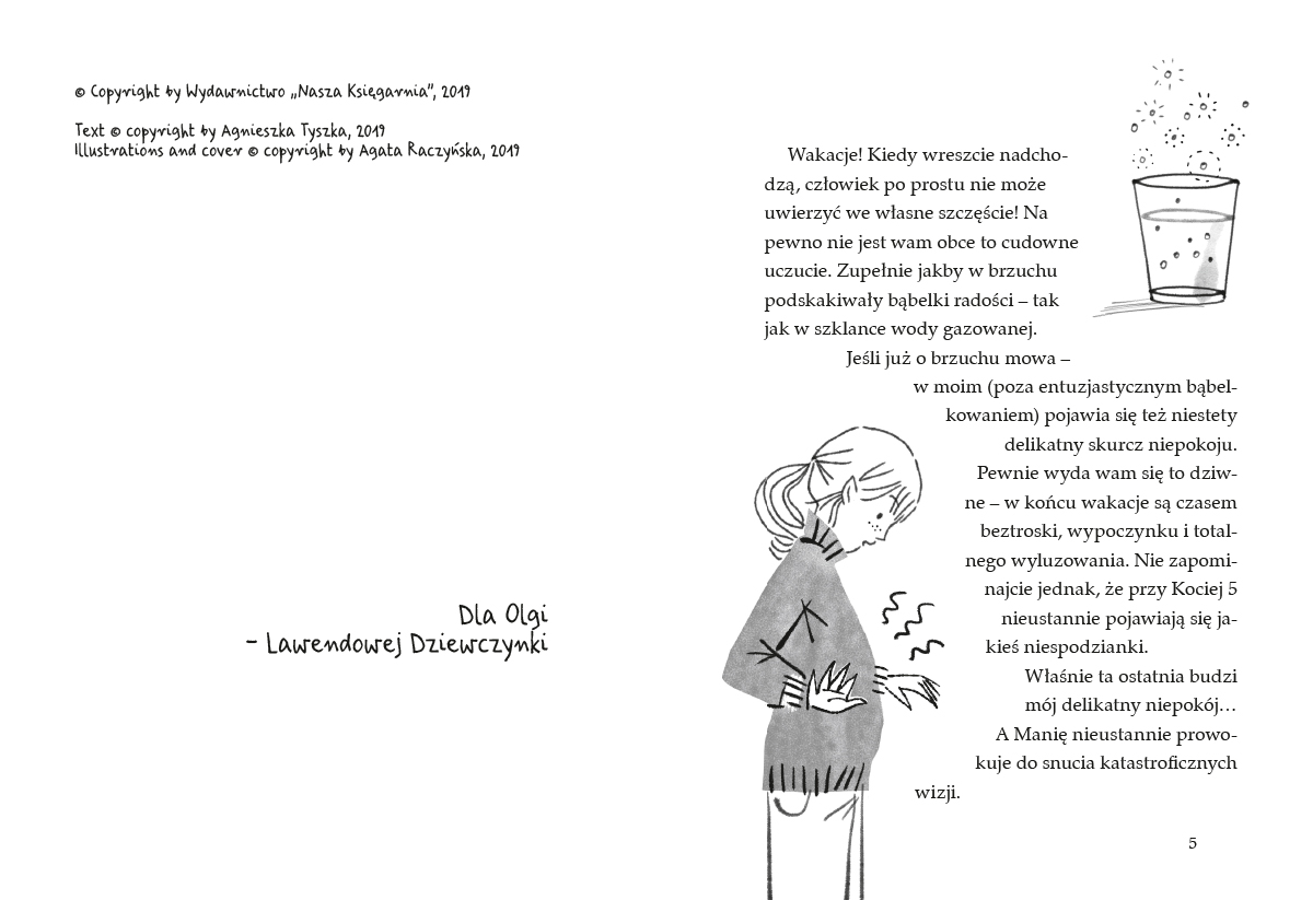 Cześć! To znowu ja – Zosia z ulicy Kociej. Spędzamy wakacje w Ośmiu Dębach (zwanych przez moją siostrę ośmioma zębami). Trochę się nudzimy, mokniemy, czytamy i zajadamy racuchy. Osiem zębów od dawna ma już okres świetności za sobą, choć dziadek Dyzio twierdzi z mocą, że pięknie jeszcze będzie. A tymczasem na Kociej trwa remont, choć na skutek pojawiających się co rusz komplikacji najwyraźniej nie zamierza się szybko skończyć. A w każdym razie – na pewno nie stanie się to w przewidywanym wcześniej terminie... (Z okładki).