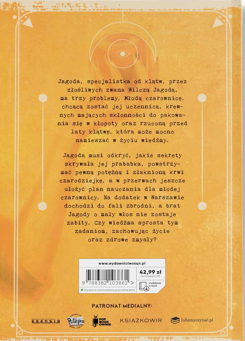 Jagoda, specjalistka od klątw, przez złośliwych zwana Wilczą Jagodą, ma trzy problemy. Młodą czarownicę, chcącą zostać jej uczennicą, krewnych mających skłonności do pakowania się w kłopoty oraz klątwę, która, choć rzucona przed laty, może mocno namieszać w życiu wiedźmy. Jagoda musi odkryć, jakie sekrety skrywała jej prababka, powstrzymać pewną potężną i złaknioną krwi czarodziejkę, a w przerwach jeszcze ułożyć plan nauczania dla młodej czarownicy. Na dodatek w Warszawie dochodzi do fali zbrodni, w którym o mały włos nie zostaje zabity brat Jagody. Czy sprosta tym zadaniom, zachowując życie oraz zdrowe zmysły? (Z okładki).