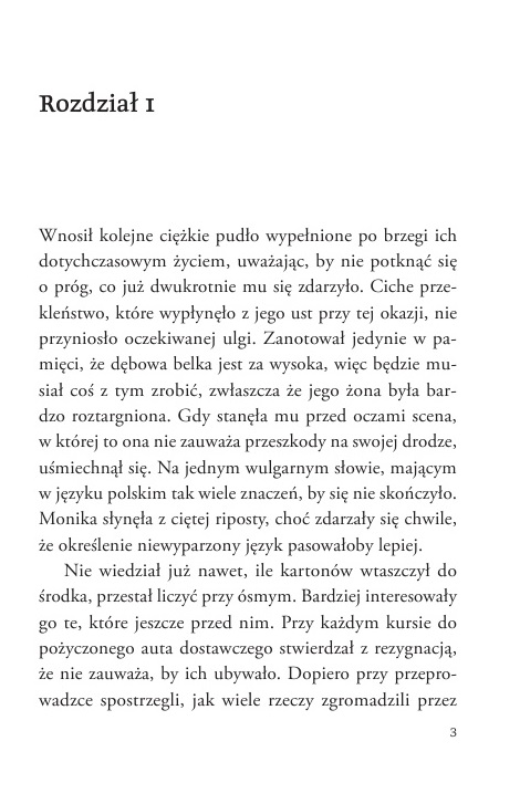 Monika i Dawid to małżeństwo połączone szczerym, pełnym uniesień i namiętności uczuciem. Uzupełniają się zarówno prywatnie, jak i zawodowo, a do pełni szczęścia brakuje im tylko dziecka. Pewni swojej pozycji w firmie przenoszą się na wieś, by odetchnąć od miejskiego zgiełku. Okazuje się jednak, że dom, który kupują, kryje wiele tajemnic z przeszłości – na czele ze zniknięciem przed laty córki sąsiadów. Kiedy Dawid znajduje stary zeszyt z rozważaniami o chorej, wypaczonej wizji miłości, oddala się od Moniki. W idealne na pozór małżeństwo wkradają się sekrety i kłamstwa. Czy młodzi przetrwają tę ciężką próbę? Kto jest autorem dziwnych zapisków? Jakie tajemnice kryje dom, który widział zbyt wiele? (Z okładki).