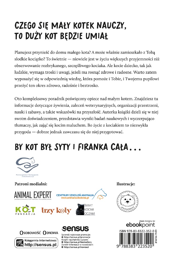 Czego się mały kotek nauczy, to duży kot będzie umiał. Planujesz przynieść do domu małego kota? A może właśnie zamieszkało z Tobą słodkie kociątko? To świetnie - niewiele jest w życiu większych przyjemności niż obserwowanie rozbrykanego, szczęśliwego kociaka. Ale kocie dziecko, tak jak ludzkie, wymaga troski i uwagi, jeżeli ma rosnąć zdrowe i radosne. Warto zatem wyposażyć się w odpowiednią wiedzę, która pomoże i Tobie, i Twojemu pupilowi przeżyć ten okres zdrowo, radośnie i beztrosko. Oto kompleksowy poradnik poświęcony opiece nad małym kotem. Znajdziesz tu informacje dotyczące żywienia, zaleceń weterynaryjnych, organizacji przestrzeni, nauki i zabawy, a także wskazówki na przyszłość. Autorka książki dzieli się w niej swoim doświadczeniem, przedstawia wyniki badań naukowych i wyczerpująco tłumaczy, jak zająć się kocim maluchem. Bo życie z kociakiem to niezwykła przygoda - dobrze jednak zawczasu się do niej przygotować. (Z okładki).