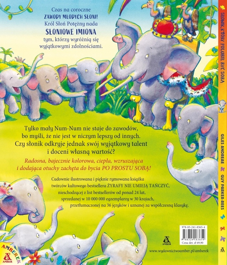 Czas na coroczne zawody młodych słoni! Król Słoń Potężny nada Słoniowe Imiona tym, którzy wyróżnią się wyjątkowymi zdolnościami. Tylko mały Num-Num nie staje do zawodów, bo myśli, że nie jest w niczym lepszy od innych. Czy słonik odkryje jednak swój wyjątkowy talent i doceni własną wartość? (Z okładki).