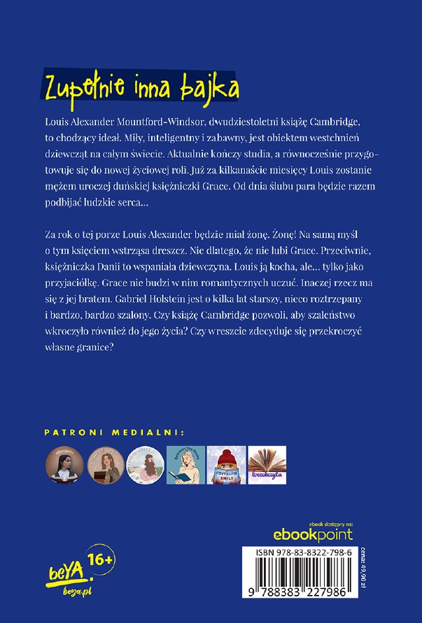 Zupełnie inna bajka. Louis Alexander Mountford-Windsor, dwudziestoletni książę Cambridge, to chodzący ideał. Miły, inteligentny i zabawny, jest obiektem westchnień dziewcząt na całym świecie. Aktualnie kończy studia, a równocześnie przygotowuje się do nowej życiowej roli. Już za kilkanaście miesięcy Louis zostanie mężem uroczej duńskiej księżniczki Grace. Od dnia ślubu para będzie razem podbijać ludzkie serca... Za rok o tej porze Louis Alexander będzie miał żonę. Żonę! Na samą myśl o tym księciem wstrząsa dreszcz. Nie dlatego, że nie lubi Grace. Przeciwnie, księżniczka Danii to wspaniała dziewczyna. Louis ją kocha, ale... tylko jako przyjaciółkę. Grace nie budzi w nim romantycznych uczuć. Inaczej rzecz ma się z jej bratem. Gabriel Holstein jest o kilka lat starszy, nieco roztrzepany i bardzo, bardzo szalony. Czy książę Cambridge pozwoli, aby szaleństwo wkroczyło również do jego życia? Czy wreszcie zdecyduje się przekroczyć własne granice? (Z okładki).