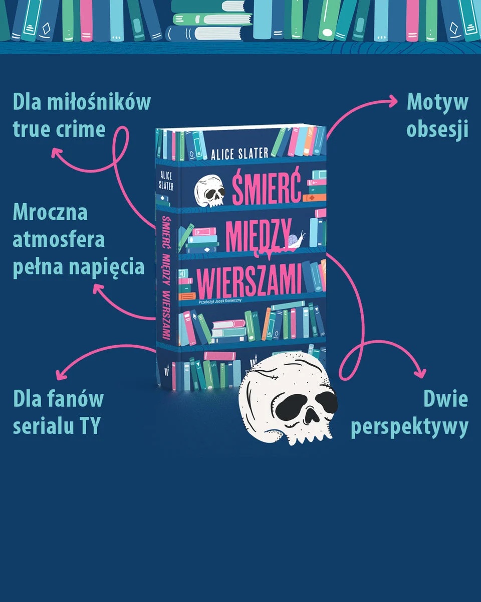 Witaj w księgarni Spines! Jakiej książki szukasz? Aspołeczna, niebudząca sympatii księgarka o ksywce Pluskwa woli zamykać się w świecie lektur i podcastów o mrocznych umysłach seryjnych morderców, niż odpowiadać na przewidywalne i męczące pytania klientów. Pewnego dnia w księgarni, w której pracuje, zostaje zatrudniona charyzmatyczna i pisząca poezję Laura, stanowiąca całkowite przeciwieństwo Pluskwy. Ta jednak dostrzega w niej bratnią duszę i za wszelką cenę stara się zbliżyć do nowej koleżanki. Choć Laura trzyma dziewczynę na dystans, niezrażona Pluskwa zaczyna szperać w jej przeszłości i odkrywa rodzinną tragedię. Gdy uświadamia sobie, że natknęła się na autentyczną historię true crime, jej zainteresowanie Laurą przeradza się w niebezpieczną obsesję… "Śmierć między wierszami" to intrygująca książka przepełniona mroczną atmosferą i bolesnymi wspomnieniami z dzieciństwa. Autorka stawia pytania dotyczące fascynacji true crime oraz etyczności dzielenia się opowieściami, które należą do kogoś innego. (Nota wydawcy).