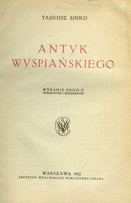 Antyk Wyspiańskiego / Tadeusz Sinko. - Wyd. 2 uzup. i rozszerz. - Warszawa : Bibljoteka Polska, 1922. - 370 s., [10] k. tabl. : rys. ; 22 cm.