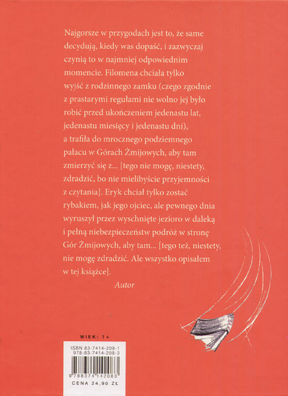 Góry Żmijowe to opowieść o przygodach nastoletnich bohaterów z dwóch krain objętych władaniem Starej Magii, oddzielonych górami - królewny Filomeny z Maare i Eryka, syna rybaka z Szertaty. Filomena, której przed ukończeniem dwunastu lat nie wolno opuszczać pałacu, za wszelką cenę pragnie się z niego wydostać. Wyrażona na głos deklaracja sprawia, iż wiatr przenosi ją w Góry Żmijowe, do pieczary Żmija - zielonobłękitnego potwora. Tymczasem Eryk dowiaduje się, że jego przeznaczeniem jest ocalenie Szertaty przed suszą. Wyrusza w stronę Gór Żmijowych, gdzie ma odnaleźć ognistego ptaka i zdobyć jego pióra. Utrzymana w konwencji fantasy, napisana żywym językiem i bardzo filmowa w charakterze baśń Zygmunta Miłoszewskiego to świetna lektura dla dzieci wychowanych na takich filmach jak Potwory i spółka czy Shrek. Autor z powodzeniem posługuje się absurdalnym humorem i pastiszem, ale jego książka jest przede wszystkim pełną cudownych zdarzeń opowieścią o dobru i złu, o zasłużonej nagrodzie i karze. (Nota wydawcy).