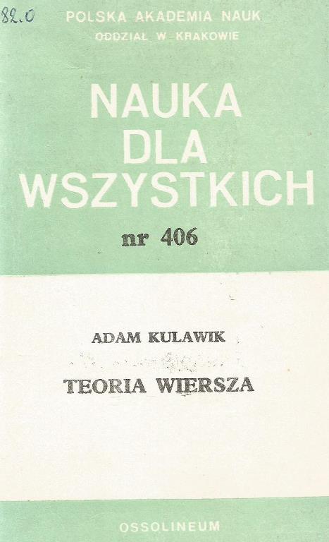 Teoria wiersza / Adam Kulawik. - Wrocław, Kraków [etc.] : Zakład Narodowy im. Ossolińskich. Oddział, 1987. - 53, [1] s. ; 18 cm.