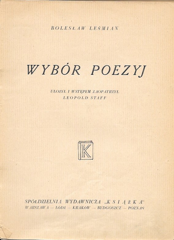 Wybór poezyj / Bolesław Leśmian ; ułożył i wstępem zaopatrzył Leopold Staff. - Warszawa ; Kraków [etc.] : Książka. Oddz., [1946] (Kraków : Drukarnia Nr 3). - 166, [2] s. ; 20 cm.