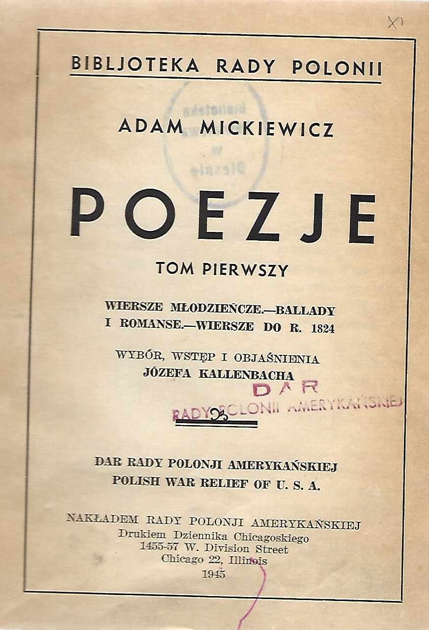 Na stronie tytytułowej: Dar Rady Polonji Amerykańskiej. Polish War Relief of U.S.A. Drukiem Dziennika Chicagoskiego