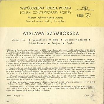 Wiersze wybrane czyta autorka / Wisława Szymborska. - Warszawa : Polskie Nagrania, [1967]. - 1 płyta gramofonowa : analog., 45 o/min, mono. ; 18 cm.