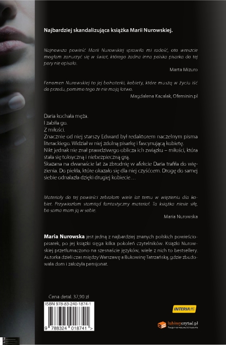 Daria kochała męża. I zabiła go. Z miłości. Znacznie od niej starszy Edward był redaktorem naczelnym pisma literackiego. Widział w niej zdolną pisarkę i fascynującą kobietę. Nikt jednak nie znał prawdziwego oblicza ich związku - miłości, która stała się toksyczną i niebezpieczną grą. Skazana na dwanaście lat za zbrodnię w afekcie Daria trafiła do więzienia. Do piekła, które okazał się dla niej czyśćcem. Drogę do samej siebie odnalazła dzięki drugiej kobiecie... (Z okł.)