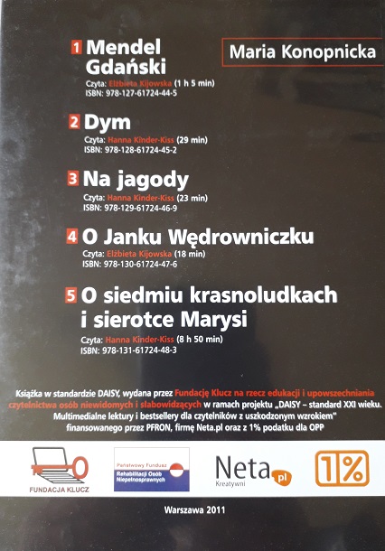 Czytają: Elżbieta Kijowska (Mendel Gdański, O Janku Wędrowniczku), Hanna Kinder-Kiss (Dym, Na jagody, O siedmiu krasnoludkach i sierotce Marysi).
