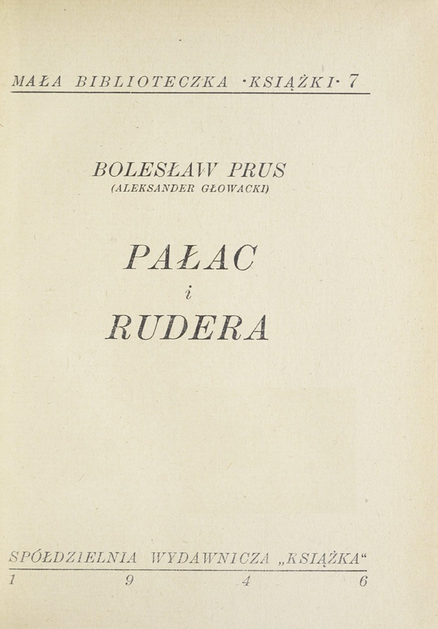 Pałac i rudera / Bolesław Prus (Aleksander Głowacki). - [Warszawa] : Książka, 1946. (Łódź : Drukarnia "Książka"). - 142, [2] strony ; 20 cm.