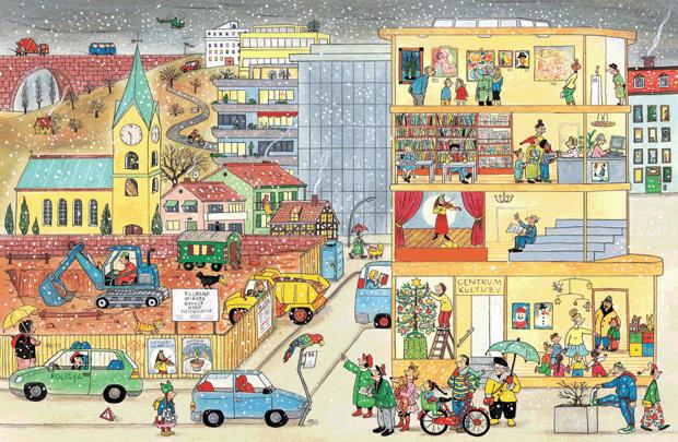 Pełna zabawnych szczegółów, sympatycznych postaci i ujmująco codziennych sytuacji książka obrazkowa, w której nie pada ani jedno słowo. Każda strona tej książki to barwna, pełna szczegółów i postaci ilustracja przedstawiająca fragment miasta. Na kolejnych rozkładówkach odnajdujemy tych samych bohaterów w różnych miejscach i momentach dnia. Wypatrywanie ich i układanie opowieści o ich przygodach to wciągająca zabawa na długie godziny. (Z noty wydawcy).