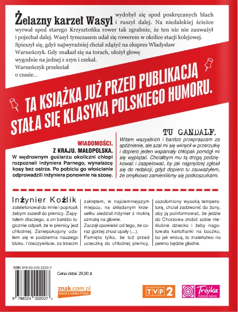 Można – jak to ma w zwyczaju Żelazny Karzeł Wasyl – wielokrotnie pożegnać się z życiem. Skręcając się ze śmiechu przy lekturze tej książki. W tych szalonych, brawurowo napisanych kronikach znajdziecie: - intymne porady aż dwóch specjalistów: Gandalfa i Mgra Czupurnego - przygody Żelaznego Karła Wasyla - spostrzeżenia pana Henia - pamiętnik Doktora Wyciora - najważniejsze wiadomości z kraju i ze świata Kto pamięta tych bohaterów z fal radiowej Trójki i innych anten, będzie szczęśliwy, spotykając ich ponownie, kto nie pamięta - tym bardziej nie będzie zawiedziony. To już klasyka polskiego humoru. Dostajemy także opowieść o tym, jak trudne życie ma Wojciech Mann ze swoim wydawcą. A z drugiej strony, jak nadludzkich wysiłków i forteli potrzeba, by wydać książkę rozchwytywanego autora. Nic w tej książce nie jest takie, jakie się wydaje. Nade wszystko zaskakuje Wojciech Mann - nawet widzów i czytelników przyzwyczajonych do jego błyskotliwych gagów. (Nota wydawcy).