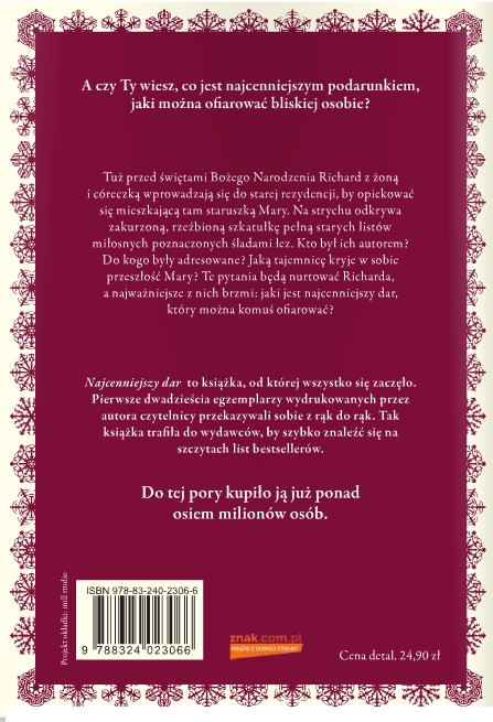 Tuż przed Bożym Narodzeniem Richard z żoną i córeczką wprowadzają się do starej rezydencji, by opiekować się mieszkającą tam staruszką Mary. Pewnej nocy pisarza budzi piękna melodia. Poszukując źródła tajemniczych dźwięków, Richard trafia na strych, gdzie odkrywa zakurzoną, rzeźbioną skrzynkę, pełną starych miłosnych listów, naznaczonych śladami łez. Kto był ich autorem? Do kogo były adresowane? Ta zagadka będzie nurtować autora wraz z pytaniem zadanym przez Mary: co było pierwszym darem ofiarowanym na Boże Narodzenie? (Nota wydawcy)
