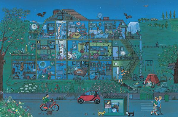 Każda strona tej książki to barwna, pełna szczegółów i postaci ilustracja przedstawiająca fragment miasta. Na kolejnych rozkładówkach odnajdujemy tych samych bohaterów w różnych miejscach i momentach dnia. Wypatrywanie ich i układanie opowieści o ich przygodach to wciągająca zabawa na długie godziny. (Z noty wydawcy).