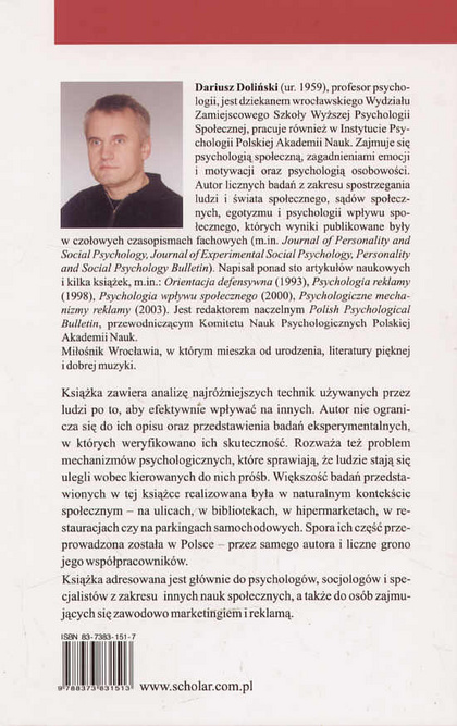 Techniki wpływu społecznego / Dariusz Doliński. - Warszawa : Scholar, cop. 2008. - 334, [2] s. : il. ; 24 cm.