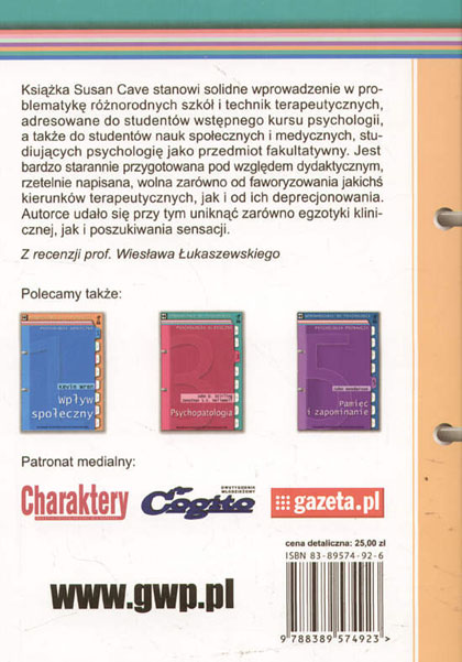 Książka adresowana do studentów wstępnego kursu psychologii, a także do studentów nauk społecznych i medycznych. Stanowi solidne wprowadzenie w problematykę różnorodnych szkół i technik terapeutycznych. Autorka przedstawia wiele terapii stosowanych obecnie, a wśród nich podejście poznawczo-behawioralne, humanistyczne i psychodynamiczne. Omawia ich wykorzystanie w leczeniu różnych zaburzeń psychicznych.