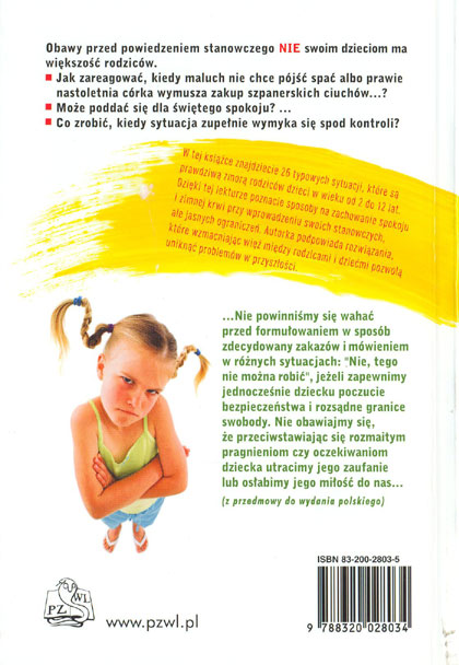 Tyt. oryg.: The answer is no : saying it and sticking to it, 1994. - Na okł.: Mówić nie i trzymać się tego, jak ograniczać: oglądanie telewizji, słodycze, późne chodzenie spać, makijaż, markowe ciuchy.