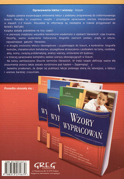 Na okł.: Omówienia epok, streszczenia lektur, zakres całego liceum, interpretacje wierszy. Wszystkie lektury z podstawy programowej. Zgodne ze standrdami wymagań egzaminacyjnych. Liceum, technikum.