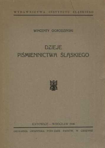 Dzieje piśmiennictwa śląskiego. [T. 1] / Wincenty Ogrodziński. - Katowice ; Wrocław : Instytut Śląski, 1946 (Cieszyn : Drukarnia Cieszyńska). - 213, [2] s. ; 21 cm.