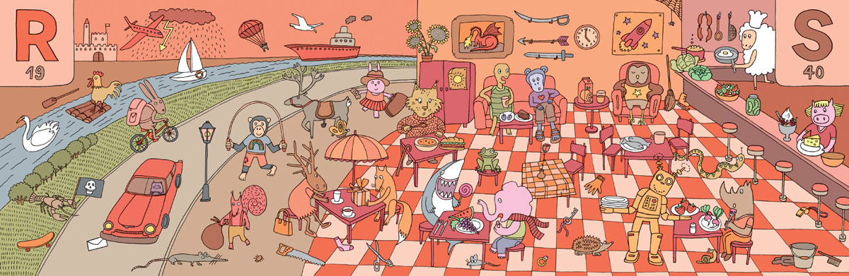 Pomysłowa książka obrazkowa do zabawy w wyszukiwanie słów. Ale tu tłoczno! Gdzie nie spojrzeć, aż roi się od postaci, przedmiotów i zwierząt. Czy znasz ich nazwy? Sprawdź to! Na czym gra łoś muzykant? Kto zagląda w paszczę krokodyla? Jakie zwierzę ściga się z zającem? Wyszukuj rzeczy, których nazwy zaczynają się na literę podaną w lewym lub prawym górnym rogu ilustracji. Czy uda Ci się odnaleźć wszystkie? Liczba pod literą podpowie ci, ile jest ich na pewno. A może zdołasz znaleźć jeszcze więcej? Do dzieła! Jeśli potrafisz, możesz szukać słów także w innych językach. (Zokładki).
