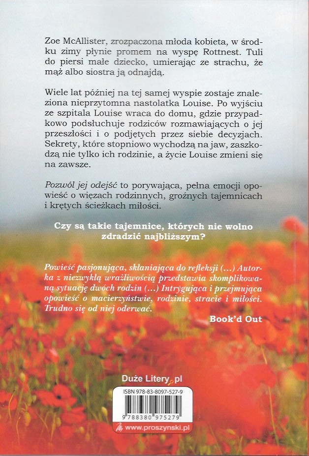 Zoe McAllister, zrozpaczona młoda kobieta, w środku zimy płynie promem na wyspę Rottnest. Tuli do piersi małe dziecko, umierając ze strachu, że mąż albo siostra ją odnajdą. Wiele lat później, na tej samej wyspie zostaje znaleziona nieprzytomna nastolatka Louise. Po wyjściu ze szpitala Louise wraca do domu, gdzie przypadkowo podsłuchuje rodziców rozmawiających o jej przeszłości i o podjętych przez siebie decyzjach. Sekrety, które stopniowo wychodzą na jaw, zaszkodzą nie tylko ich rodzinie, a życie Louise zmieni się na zawsze. Pozwól jej odejść to porywająca, pełna emocji opowieść o więzach rodzinnych, groźnych tajemnicach i krętych ścieżkach miłości. Czy są takie tajemnice, których nie wolno zdradzić najbliższym? (Z okł.).
