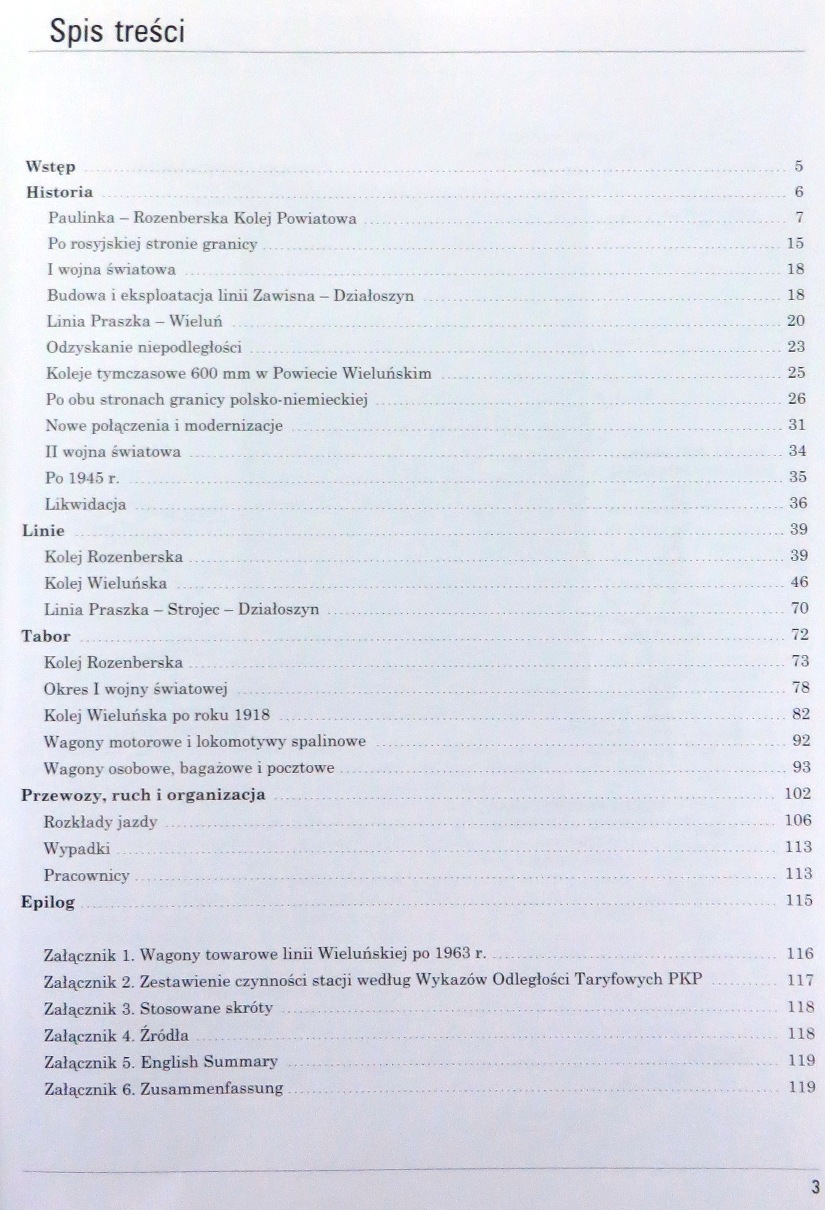 Książka przedstawia historię nieistniejących już kolei wąskotorowych pomiędzy Olesnem, Gorzowem Śląskim, Działoszynem, Praszką i Wieluniem. Na dawnym pograniczu zaborów, a później przy granicy II Rzeczpospolitej oraz w województwie sieradzkim do 1987 roku istniał transport wąskotorowy dobrze służący lokalnym społecznościom. Przez prawie 90 lat funkcjonowania zarówno oleska "Paulinka" jak i kolej Praszka - Wieluń wpisały się w krajobraz i życie społeczne. Stare zdjęcia, bilety, dokumenty pomogą wczuć się w tamtą atmosferę. (Z noty wydawcy).