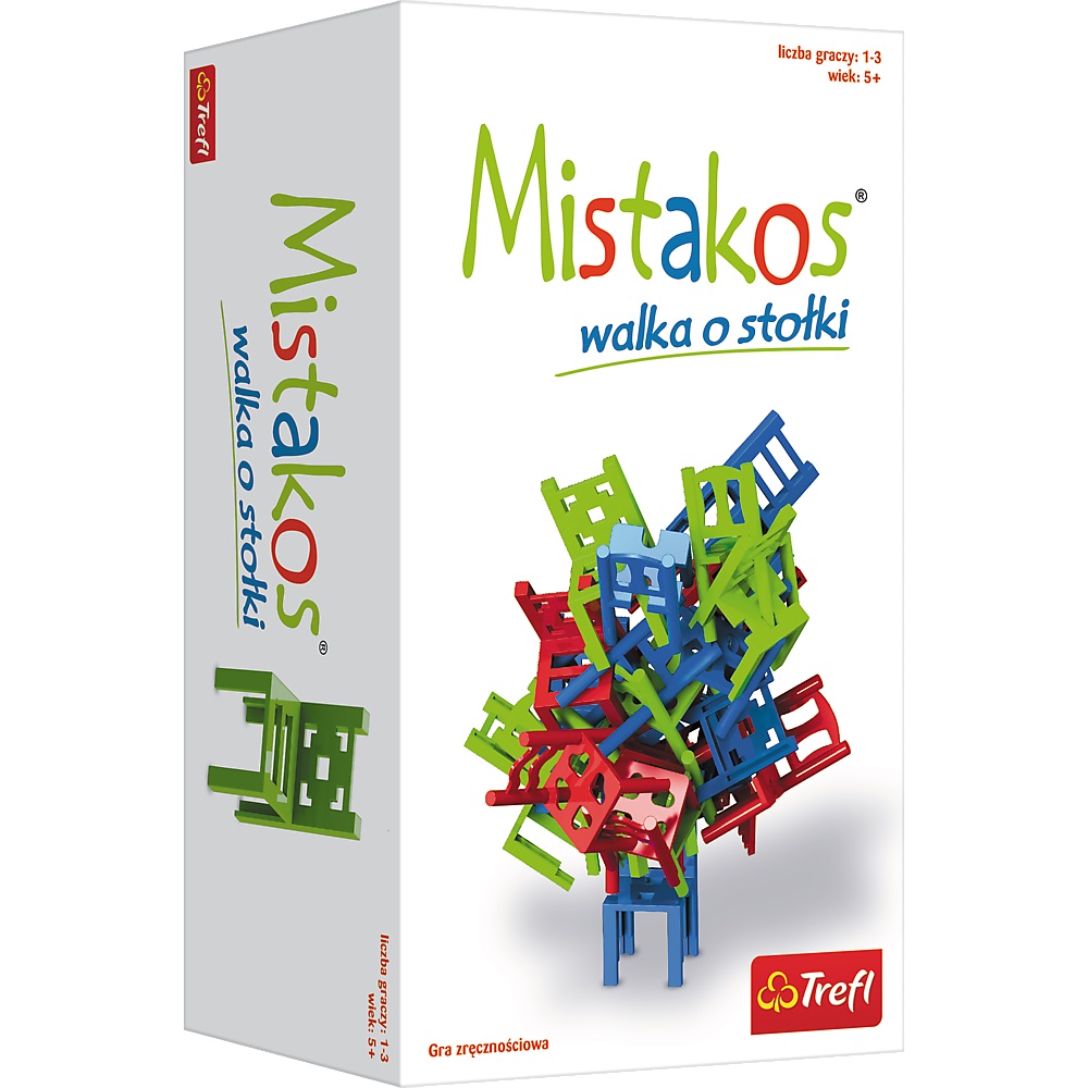 „Mistakos” to klasyczna gra zręcznościowa dla dzieci – i nie tylko! „Walka o stołki” z pewnością pochłonie również starszych graczy. Zapewnij swojej rodzinie wciągająca rozrywkę z nutką zdrowej rywalizacji! Na czym polega gra planszowa „Mistakos”? Na wielkim meblowaniu – i to dosłownie. W kartonowym opakowaniu znajdziesz zestaw 24 krzesełek w różnych kolorach: niebieskim, zielonym oraz czerwonym. Każdy gracz musi wykazać się bystrym okiem i zwinnymi palcami, by zostać mistrzem budowania wymyślnych konstrukcji. Gracz wybiera krzesło w swoim kolorze i dokłada do stosu poprzednich tak, by cała konstrukcja nie legła w gruzach. Kto pierwszy skusi, otrzyma karne punkty. Zadanie nie jest proste, ponieważ trzeba dobrze wybrać miejsce i stabilnie zahaczyć krzesło. Za nogę, oparcie, siedzisko – bez różnicy, byle zachować konstrukcję!