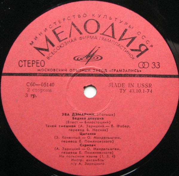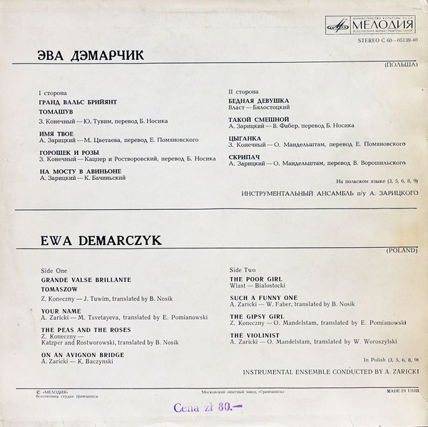 Na drugiej stronie okładki: Eva Demarčik ; Instrumental'nyj ansambl' p/u A. Zarickogo = Ewa Demarczyk ; Instrumental ensemble conducted by A. Zaritsky.