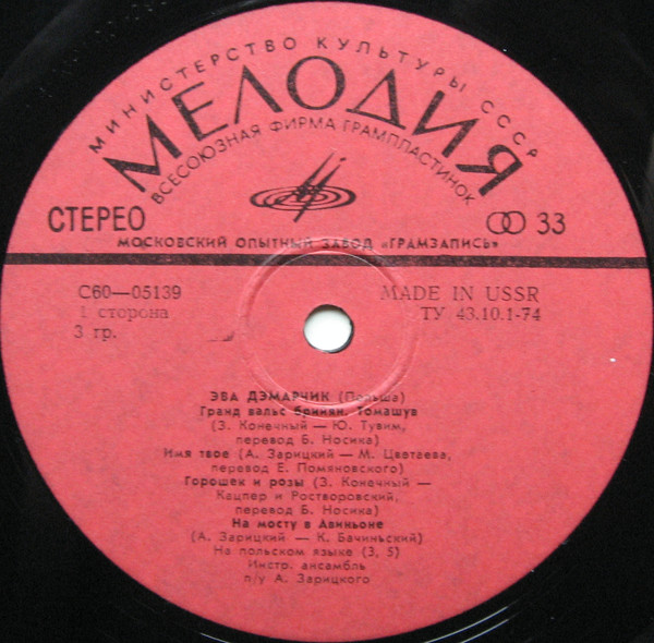 Eva Demarčik (Pol'ša). - [Moskva] : Melodiâ Vsesoûznaâ Firma Gramplastinok, [1980] (Moskovskij Opytnyj Zavod "Gramzapis'"). - 1 płyta gramofonowa : zapis analogowy, 33 o/min, stereo. ; 30 cm.