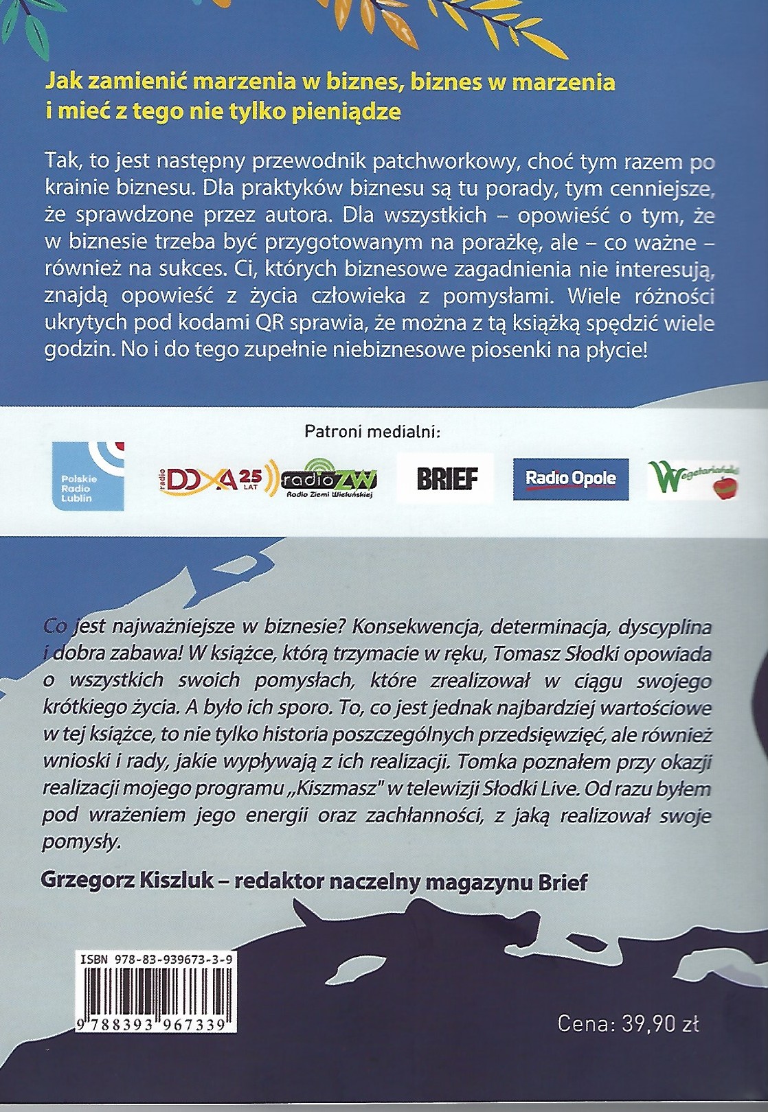 Tak, to jest następny przewodnik patchworkowy, choć tym razem po krainie biznesu. Dla praktyków biznesu są tu porady, tym cenniejsze, że sprawdzone przez autora. Dla wszystkich – opowieść o tym, że w biznesie trzeba być przygotowanym na porażkę, ale – co ważne – również na sukces. Ci, których biznesowe zagadnienia nie interesują, znajdą opowieść z życia człowieka z pomysłami. Wiele różności ukrytych pod kodami QR sprawia, że można z tą książką spędzić wiele godzin. No i do tego zupełnie niebiznesowe piosenki na płycie! (Z okładki).