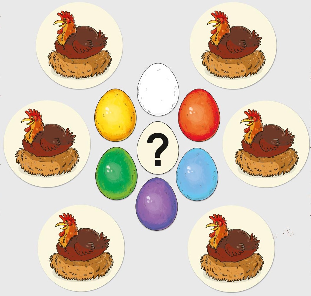 Zasady są bardzo proste. Mamy trzy typy kartoników – kury, gniazda i jajka. Na gniazdach ustawiamy kartoniki z kurkami tak, by nie było widać, jakie jajko wysiadują. Jedno gniazdo zostaje puste. Obok kładziemy jajka znakiem zapytania do góry. (...) Zabawa polega na znalezieniu pary – jajka i kury, która wysiaduje ten sam kolor. Odsłaniamy jajko, sprawdzamy, jakiej jest barwy i wybieramy kurę, by sprawdzić, czy wysiaduje właśnie to jajko. Jeśli trafiamy, mamy punkt i zabieramy jajko. Niezależnie jednak od tego, czy trafiliśmy, czy nie, kurę należy przenieść do kolejnego gniazda. Wygrywa ten, kto zbierze najwięcej jajek.