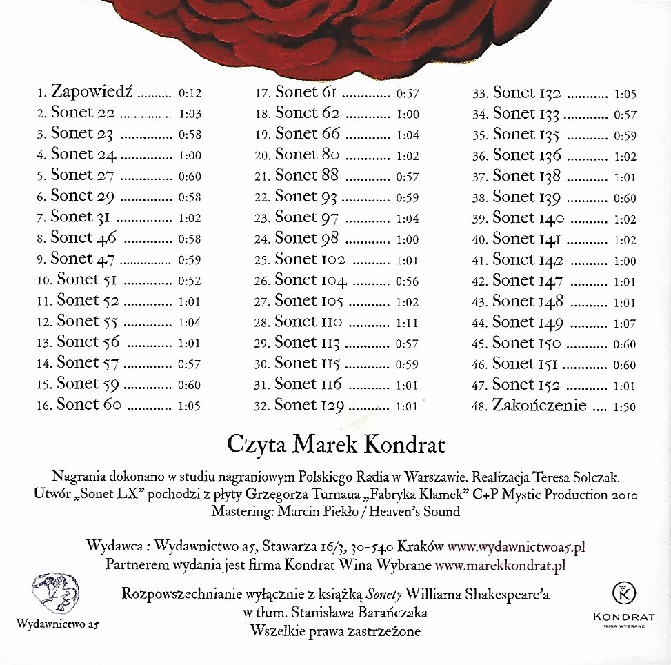 Kontrowersje wokół tak zwanej zagadki "Sonetów" bynajmniej nie wygasły. Trudno byłoby im zresztą wygasnąć, skoro w dziele tym i w okolicznościach z nim związanych zagadkowe jest właściwie prawie wszystko, a garstka ustalonych faktów, zamiast coś wyjaśniać, pączkuje bezustannie nowymi zagadkami i nowymi kontrowersjami. Jest rzeczą naprawdę zdumiewającą, że niecałe cztery stulecia dzielące nas od momentu pojawienia się jednego z najsławniejszych dziś dzieł najsławniejszego pisarza naszej planety stanowią akurat w tym wypadku tak nieprzeniknioną przesłonę. Prawda, że i o samym Shakespearze wiadomo nam zdumiewająco mało. "Sonety" są jednak w jego biografii tworczej epizodem najbardziej tajemniczym. (S. Barańczak) (Ze Wstępu).