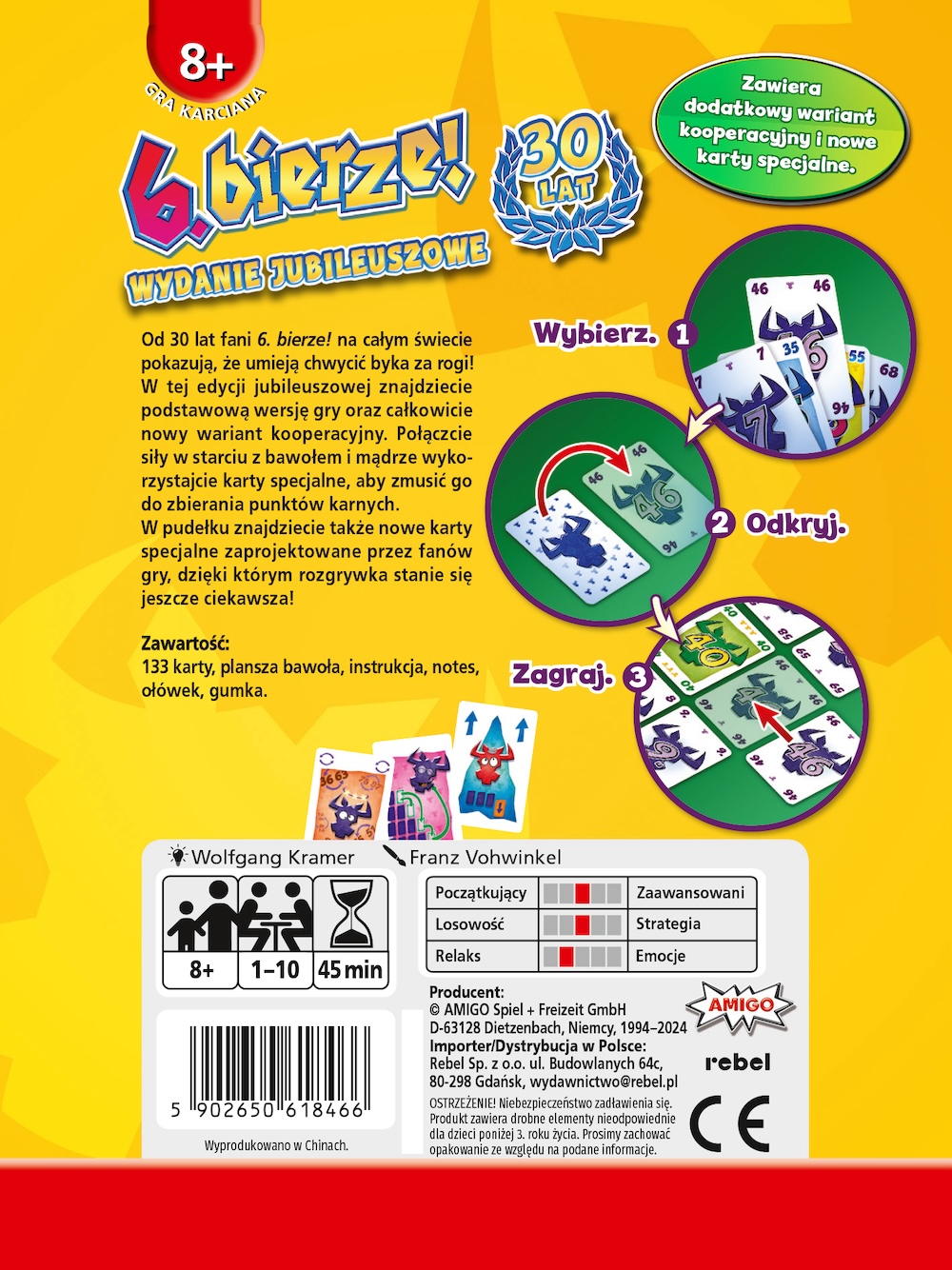 6.bierze! / Wolfgamg Kramer ; [ilustracje] Franz Vohwinkel. - Wydanie jubileuszowe. - Dietzenbach : Amigo Spiel + Freizeit GmbH ; Gdańsk : Rebel, 2024. - 1 gra (wiele elementów) : ilustracje ; w pudełku 16x12x5 cm + instrukcja (25 stron).