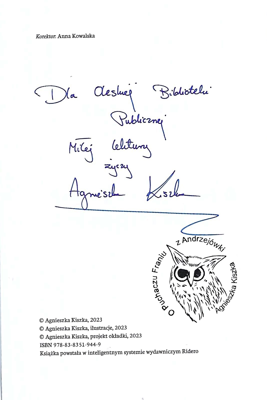 Egzemplarz OBP z dedykacją dla biblioteki.