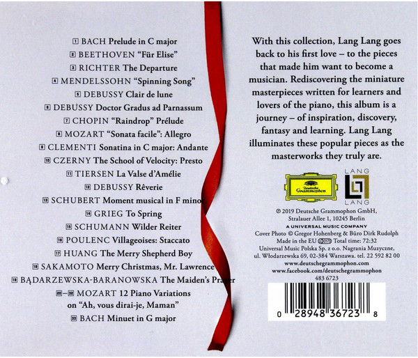 Zawiera: Prelude in C major BWV 846 / Johann Sebastian Bach (2:19). Bagatelle no. 25 in A minor, "Für Elise" WoO 59 / Ludwig van Beethoven (3:26). The departure / Max Richter (2:31). Song without words in C major, "Spinning song" op. 67 no. 4 / Felix Mendelssohn (1:49). Clair de lune L. 75 no. 3 / Claude Debussy (6:47). Doctor Gradus ad Parnassum L. 113 no. 1 / Claude Debussy (2:48). Prelude in D flat major, "Raindrop" op. 28, no. 15 / Frédéric Chopin (6:35). Allegro from Piano sonata no. 16 in C major, "Sonata facile" K 545 / Wolfgang Amadeus Mozart (4:55). Andante (in F major) from Sonatina in C major op. 36 no. 1 / Muzio Clementi (1:32). Presto op. 299 no. 1 from The School of Velocity / Carl Czerny (0:35). La valse d'Amélie / Yann Tiersen (2:50). Rêverie L. 68 / Claude Debussy (5:30). Moment musical in F minor D 780 no. 3 / Franz Schubert (2:03). To Spring op. 43 no. 6 / Edvard Grieg (3:59). Wilder Reiter op. 68 no. 8 / Robert Schumann (0:40). Staccato FP 65 no. 2 / Francis Poulenc (0:44). The merry shepherd boy / Hu-Wei Huang (1:33). Merry Christmas, Mr. Lawrence / Ryuichi Sakamoto (5:36). The maiden's prayer, op. 4 / Tekla Bądarzewska-Baranowska (4:26). 12 piano variations in C major on "Ah, vous dirai-je Maman" K 265 (300e) / Wolfgang Amadeus Mozart. Minuet in G major / Johann Sebastian Bach ; composed by Christian Petzold (1:41).
