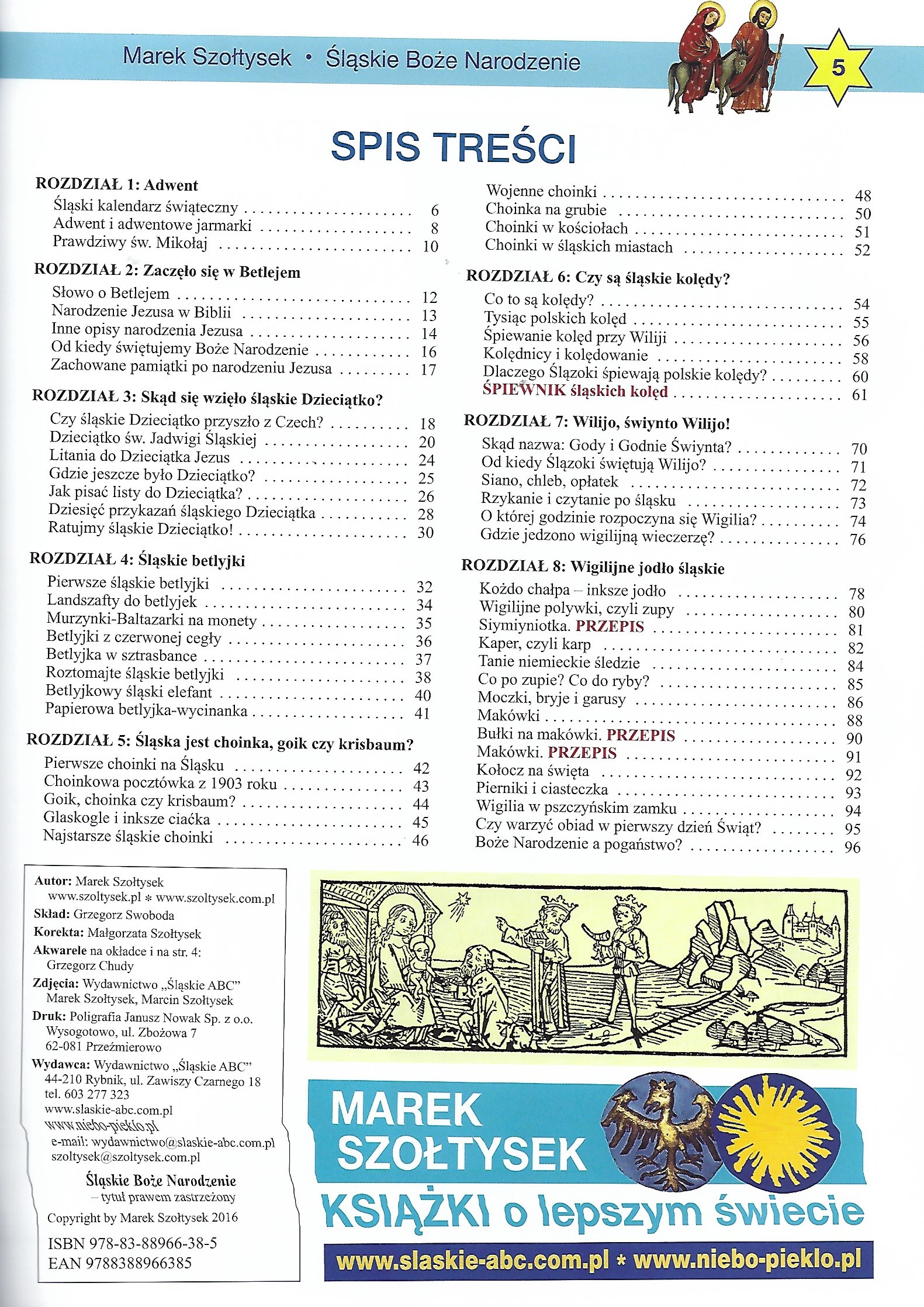 Śląskie Boże Narodzenie, to opowieść o świętowaniu Bożego Narodzenia na Śląsku. Książka zawiera odpowiedzi na liczne pytania, m.in: dlaczego prezenty przynosi Dzieciątko, skąd się wzięło sianko, makówki, od kiedy jadano karpie, śledzie, opłatek, jak robi się śląskie betlyjki? Są tu niespotykane gdzie indziej teksty 20 śląskich kolęd.