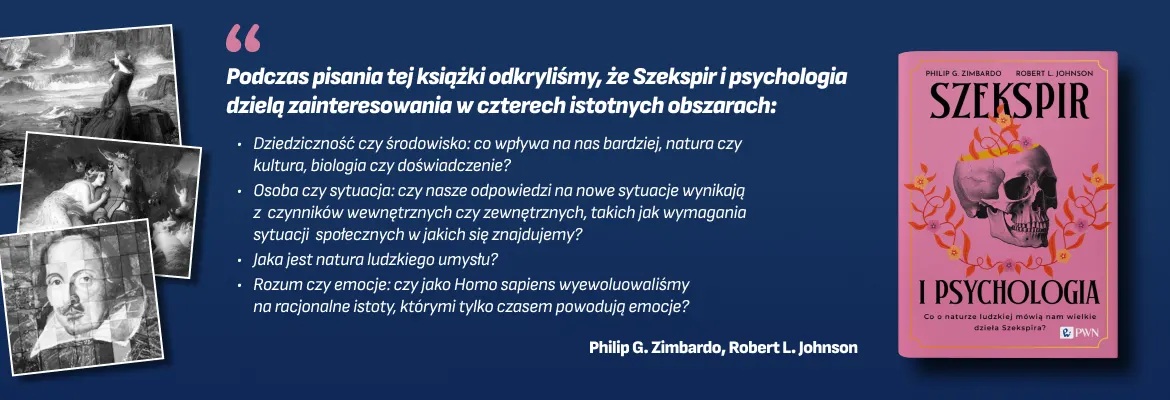 Od ponad stulecia, od kiedy Zygmunt Freud zdiagnozował u Hamleta kompleks Edypa, William Szekspir i jego dzieła stały się obiektem analiz psychologicznych. Teraz proponujemy odwrócić role. W jaki sposób sam Bard rozumiał mózg, zachowanie i sposoby działania ludzkiego umysłu? Właśnie z tym zamiarem dwaj psychologowie, Philip G. Zimbardo i Robert L. Johnson, wyruszyli w krainę Szekspira. Po dziś dzień nie stworzono opisu psychopaty lepszego niż Ryszard III, bardziej poruszającego obrazu demencji niż w Królu Learze ani równie zapadającej w pamięć ilustracji zaburzeń obsesyjno-kompulsyjnych niż próby zmycia krwawych plam przez Lady Makbet. Mniej znane i opisane są różnorodne zaburzenia psychiczne, które Szekspir przedstawił językiem odpowiadającym naszej współczesnej klasyfikacji chorób psychicznych. Psychologia Szekspira nie ograniczała się jednak do zaburzeń psychicznych. Jego fascynacja ludzką naturą obejmowała cały wachlarz zagadnień psychologicznych. Interesował się anatomią mózgu, osobowością, poznaniem, emocjami, percepcją, rozwojem i stanami świadomości. Wszystkie te opowieści pokazują, jak perspektywa Szekspira była zakorzeniona w ówczesnej medycynie i kulturze. A jednak intelekt, ciekawość i temperament dramatopisarza pozwoliły mu uchwycić pojęcia i pomysły, które wieki później stały się ważne dla nauk psychologicznych. Czytelnik dowie się więc, że to Bard ukuł trafną frazę „natura–wychowanie”, którą wypowiada Prospero sfrustrowany czynami Kalibana. Z kolei w Miarce za miarkę Szekspir skłonił widownię do rozważań na zbliżony temat, czyli co ma większy wpływ na ludzkie zachowanie: cechy osobowościowe czy zewnętrzna sytuacja? W Hamlecie zaś przyglądał się relacji pomiędzy rozumem i emocjami w umyśle, wydawałoby się, chwiejnego księcia. (Nota wydawcy).