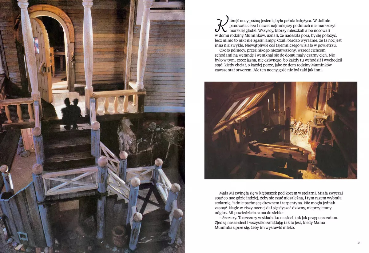 Pewnej księżycowej nocy w domu Muminków panował spokój, jednak zdecydowanie coś wisiało w powietrzu. Nikt nie zgasił lampy, jakby przeczuwając, że to noc inna niż zwykle. Nikt również nie zauważył, gdy do domu zakradł się mały czarny cień… Kim jest tajemniczy łobuz, który lubi gryźć meble oraz niezbyt przyjemnie pachnie i właśnie w niecny sposób postanowił wykorzystać fakt, że drzwi domu Muminków są zawsze otwarte? W tej wyjątkowej książce Tove Jansson zamiast rysunków autorki znajdują się fotografie wykonane przez jej brata, Pera Olova Janssona. Na zdjęciach widać model domu Muminków, który z pomocą pisarki zbudowali jej bliscy. Można go oglądać w Muzeum Muminków w Tampere. (Z okładki).