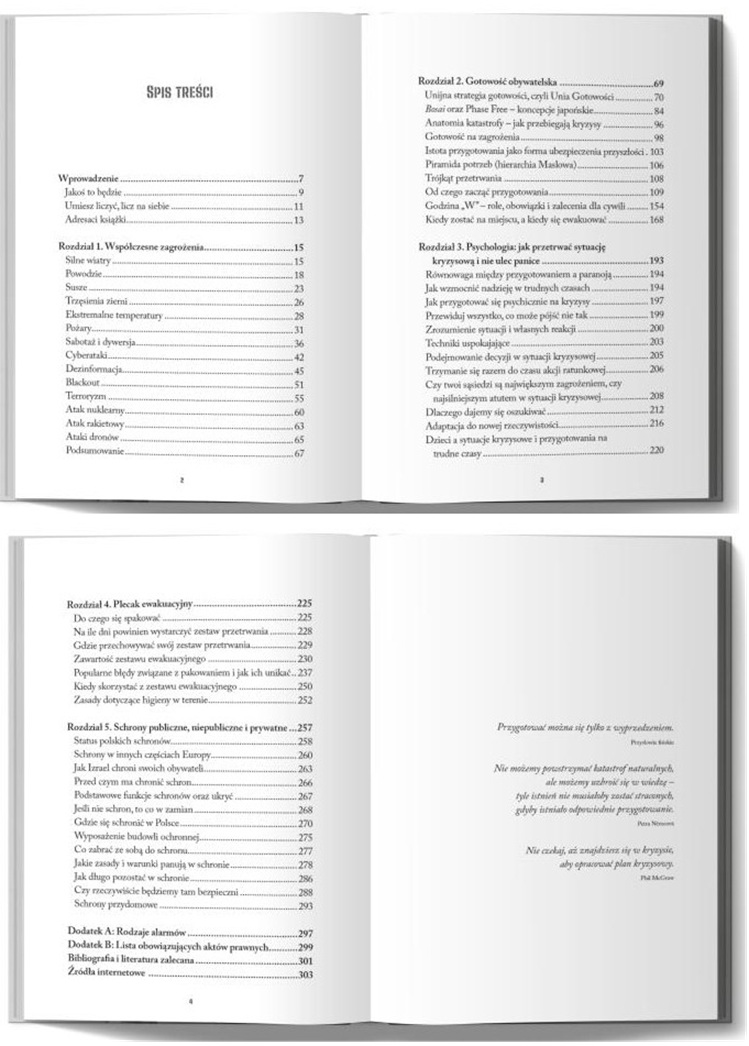 Na co dzień zajmujemy się swoim życiem i jesteśmy zbyt zabiegani, by myśleć o przyszłych zagrożeniach. Optymistycznie zakładamy, że nie spotka nas żadne niebezpieczeństwo. A co, jeśli jutro wydarzy się najgorsze? Czy wiesz, co zrobić, by zapewnić bezpieczeństwo sobie i bliskim? Ta książka to praktyczny poradnik dla każdego, kto chce poczuć się pewniej w obliczu nieprzewidywalnych zdarzeń, takich jak wybuch wojny, powódź, pożar czy blackout. Znajdziesz tu informacje na temat tego, czego dokładnie potrzebujesz oraz jak postąpić przed, podczas i po wystąpieniu zagrożenia. •Jakie są zalecenia unijne oraz strategie gotowości dla obywateli Japonii, Szwajcarii czy Izraela? •Jak przygotować rodzinny plan awaryjny i dlaczego trzeba go ćwiczyć? •Jak przechowywać zapasy wody, jedzenia, leków i materiałów medycznych? •Jak skompletować i spakować plecak ewakuacyjny, unikając częstych błędów? •Po czym poznać, że za kilka dni może wybuchnąć wojna? •Gdzie się ewakuować, gdy w okolicy nie ma schronów? •Gdzie zamontować czujniki dymu i czadu?