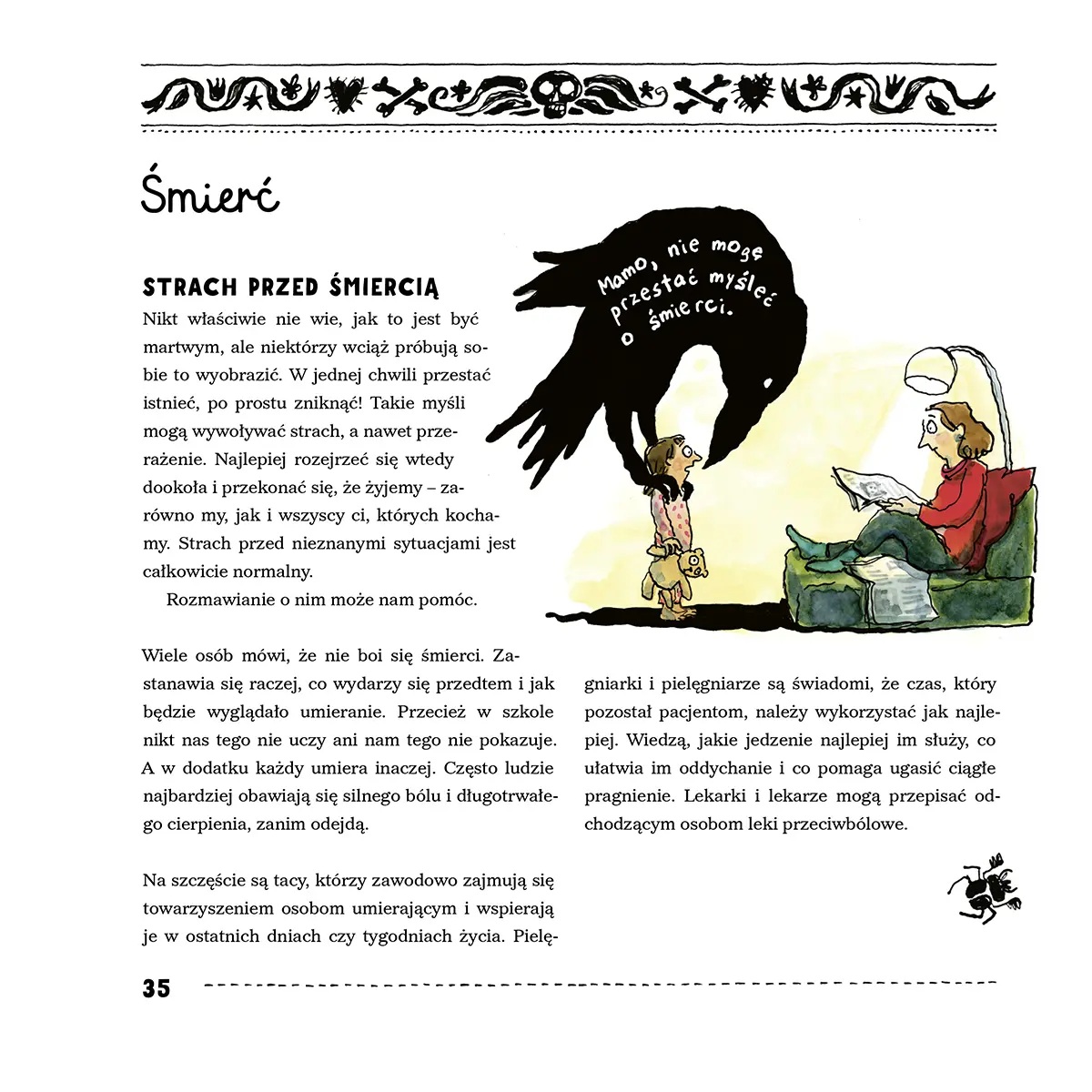 Dlaczego umieramy? Czy śmierć to coś złego? Co to właściwie znaczy – umrzeć? I co dzieje się później? "Kwiatki od spodu" to książka dla dzieci o wszystkim, co związane ze śmiercią. O umieraniu, o tym, co je poprzedza, i o tym, co po nim następuje. Znajdziecie tu solidną dawkę wiedzy i dużo ciekawostek. Niektóre informacje was zaskoczą, inne wzruszą, a jeszcze inne rozbawią. O czym przeczytacie w tej książce? O różnych rodzajach śmierci – także tych najdziwniejszych. O strachu przed śmiercią i o innych związanych z nią uczuciach. O tym, co się dzieje z ciałem zmarłej osoby. O różnych rodzajach pogrzebów i grobów. O żałobie i o tym, jak sobie z nią radzić. O zwyczajach pogrzebowych w różnych czasach, kulturach i religiach. A nawet o fantastycznych postaciach związanych ze śmiercią, takich jak zombie, wampiry czy mumie. Znajdziecie tu także rozmowy z osobami, które śmiercią zajmują się zawodowo: lekarzem, pracownikami domu pogrzebowego, ogrodnikiem cmentarnym czy towarzyszką w żałobie. (Nota wydawcy).