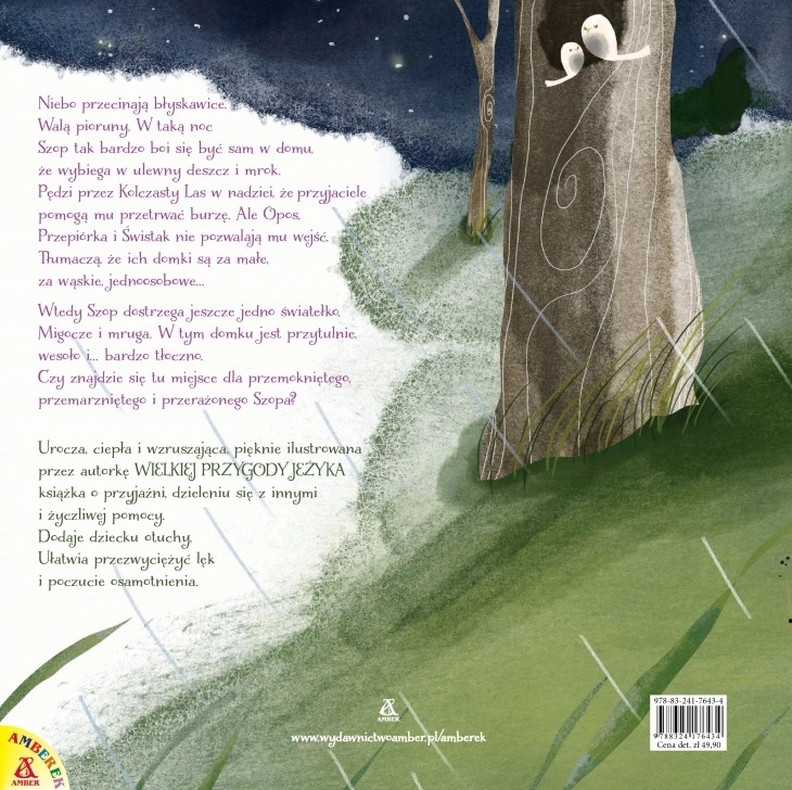 Niebo przecinają błyskawice. Walą pioruny. W taką noc Szop tak bardzo boi się być sam w domu, że wybiega w ulewny deszcz i mrok. Pędzi przez Kolczasty Las w nadziei, że przyjaciele pomogą mu przetrwać burzę. Ale Opos, Przepiórka i Świstak nie pozwalają mu wejść . Tłumaczą, że ich domki są za małe, za wąskie, jednoosobowe… Wtedy Szop dostrzega jeszcze jedno światełko. Migocze i mruga. W tym domku jest przytulnie, wesoło i… bardzo tłoczno. Czy Króliczka otworzy swój dom i serce dla przemokniętego, przemarzniętego i przerażonego Szopa? A może nawet ci, którzy odmówili mu pomocy, przekonają się, że razem jest najlepiej i najbezpieczniej? (Z noty wydawcy).