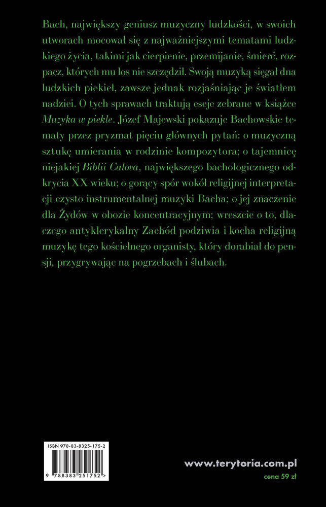 Bach, największy geniusz muzyczny ludzkości, w swoich utworach mocował się z najważniejszymi tematami ludzkiego życia, takimi jak cierpienie, przemijanie, śmierć, rozpacz, których mu los nie szczędził. Swoją muzyką sięgał dna ludzkich piekieł, zawsze jednak rozjaśniając je światłem nadziei. O tych sprawach traktują eseje zebrane w książce Muzyka w piekle. Józef Majewski ujmuje Bachowskie tematy w perspektywie pięciu głównych pytań: o muzyczną sztukę umierania w rodzinie kompozytora; o tajemnicę niejakiej Biblii Calova, największego bachlogicznego odkrycia XX wieku; o gorący spór wokół religijnej interpretacji czysto instrumentalnej muzyki Bacha; o jej znaczenie dla Żydów w obozie koncentracyjnym; wreszcie o to, dlaczego antyklerykalny Zachód podziwia i kocha religijną muzykę tego kościelnego organisty, który dorabiał do pensji, przygrywając na pogrzebach i ślubach. (Z okładki).
