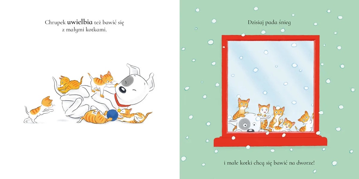 Na podwórku pojawia się śnieg. Dla Chrupka to prawdziwe wyzwanie, ponieważ piesek nie lubi zimna ani mokrych łapek, a głębokie zaspy wydają mu się straszne. Zupełnie inaczej myślą jednak jego mali przyjaciele – kocięta, które z radością wbiegają w biały puch, gotowe do zabawy. Wesołe harce kończą się jednak niespodziewanie: kocięta grzęzną w śniegu i same nie potrafią się wydostać. Teraz wszystko zależy od Chrupka. Czy piesek znajdzie w sobie odwagę, by pokonać własne obawy i pomóc ukochanym przyjaciołom? Książeczka pokazuje dzieciom w prosty, ciepły sposób, że odwaga to nie brak strachu, lecz działanie mimo lęku, zwłaszcza, gdy w grę wchodzi troska o innych. Historia uczy także empatii, odpowiedzialności i tego, jak ważna jest przyjaźń. (Z noty wydawcy).