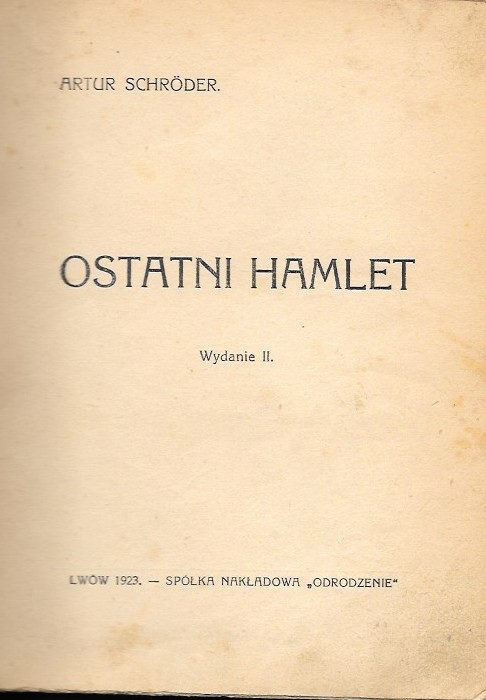 Ostatni Hamlet / Artur Schröder. - Wyd. 2. - Lwów : Odrodzenie, 1923 (Stanisławów : Drukarnia S. Chowańca). - 160 s. ; 18 cm.