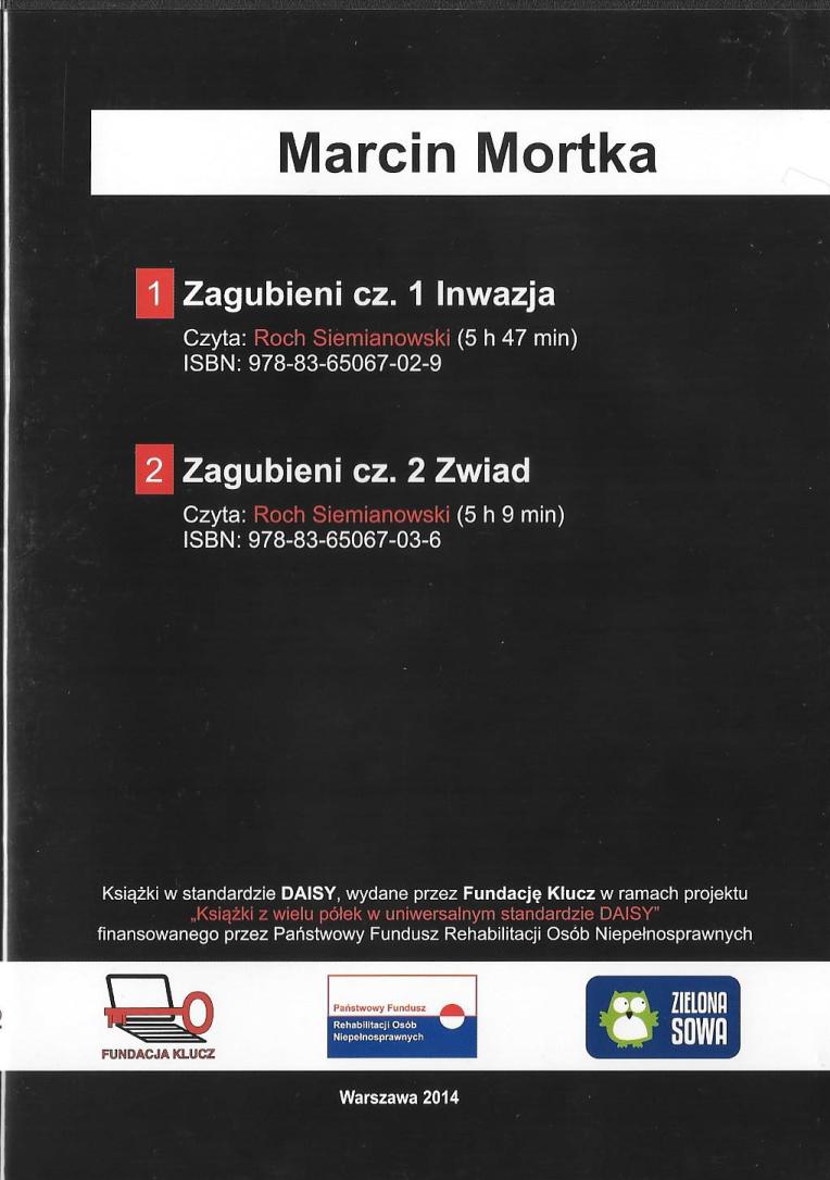Zagubieni. Cz. 1, Inwazja. Cz. 2, Zwiad / Marcin Mortka ; czyta Roch Siemianowski. - Warszawa : Fundacja Klucz, 2014. - 1 płyta [CD ROM, Daisy] (5 godz. 47 min, 5 godz. 09 min) : digital, stereo. ; 12 cm.