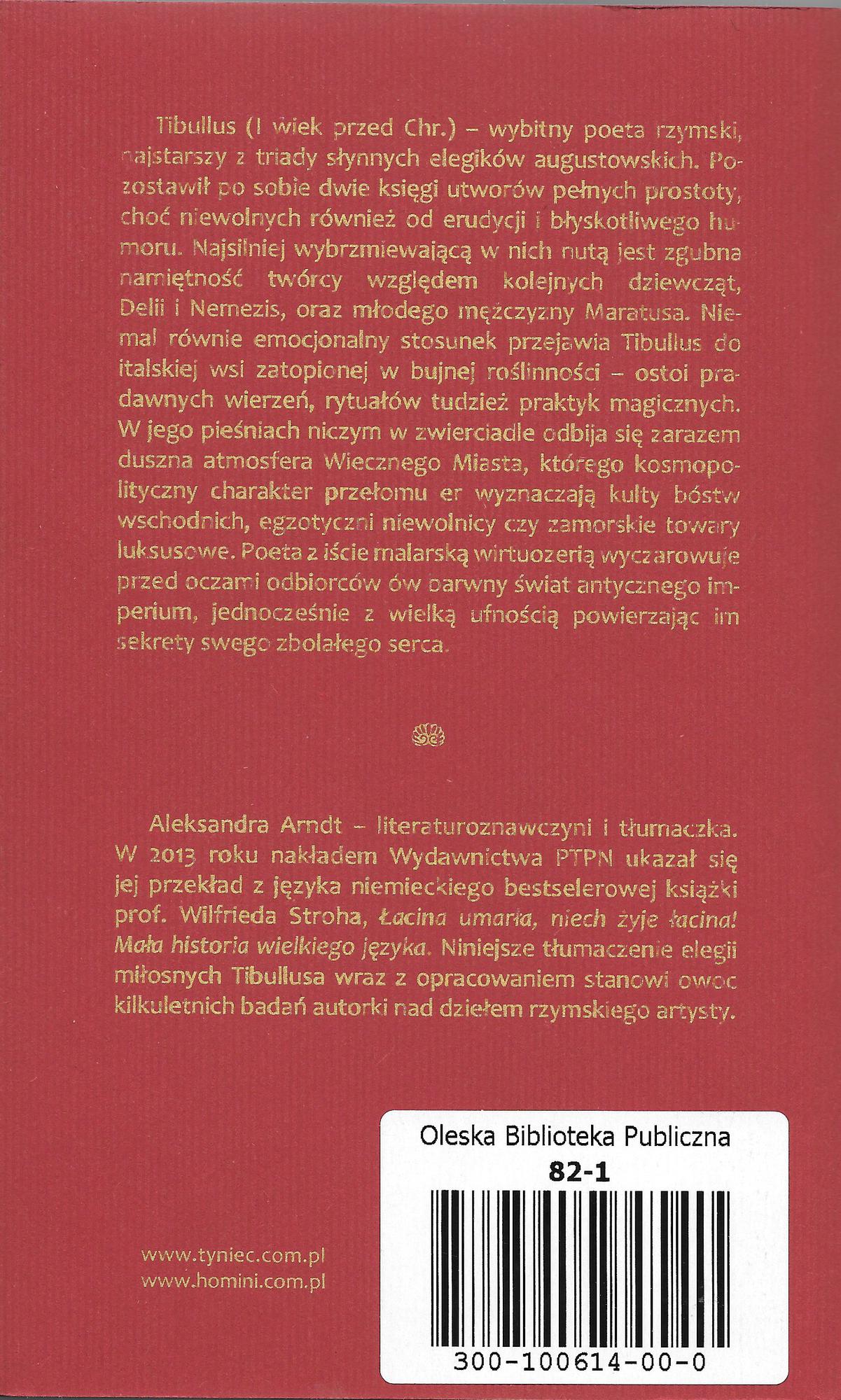 Starożytność przekazała nam pod nazwiskiem Tibullusa trzy księgi pieśni; składają się one na tzw. Corpus Tibullianum. Autorstwa poety możemy być pewni jedynie w przypadku dwóch pierwszych zbiorów – na trzeci złożyły się utwory niejakiego Lygdamusa oraz Sulpicji, rówieśnych artyście twórców o pomniejszym znaczeniu, jak również dzieła autorów anonimowych. Owe dwie księgi, stanowiące ogół osiągnięć artystycznych Tibullusa, obejmują szesnaście elegii: w pierwszej zawiera się dziesięć utworów, w drugiej – kolejnych sześć, każdy średnio około stuwersowej długości. W konfrontacji z innymi wiodącymi mistrzami pióra epoki augustowskiej – choćby Horacym czy Wergiliuszem, o wiele bardziej czynnymi zawodowo, a przy tym mierzącymi się odważnie z różnymi gatunkami literackimi – dorobek ten prezentuje się raczej nieokazale. Pierwszą rzeczą, jaka nasuwa się na myśl przy próbie jego oceny, jest oczywiście krótki czas życia autora – zaledwie około trzydziestu lat. Konstatacja tego faktu wywołać może emocje dwojakiej natury. Na pierwszy plan wysunie się tu oczywiście żal za utworami, jakie Tibullus mógłby był jeszcze napisać, gdyby tylko dane mu było żyć dłużej. Skromne rozmiary całej poetyckiej spuścizny można jednak równie dobrze wziąć za dobrą monetę: skromność bowiem to właściwe słowo-klucz, na sposób niezwykle trafny charakteryzujące całą istotę Tibullusowej poezji. Objętość dzieła poniekąd anonsuje zatem treści, z którymi skonfrontujemy się w trakcie lektury. (Nota wydawcy).