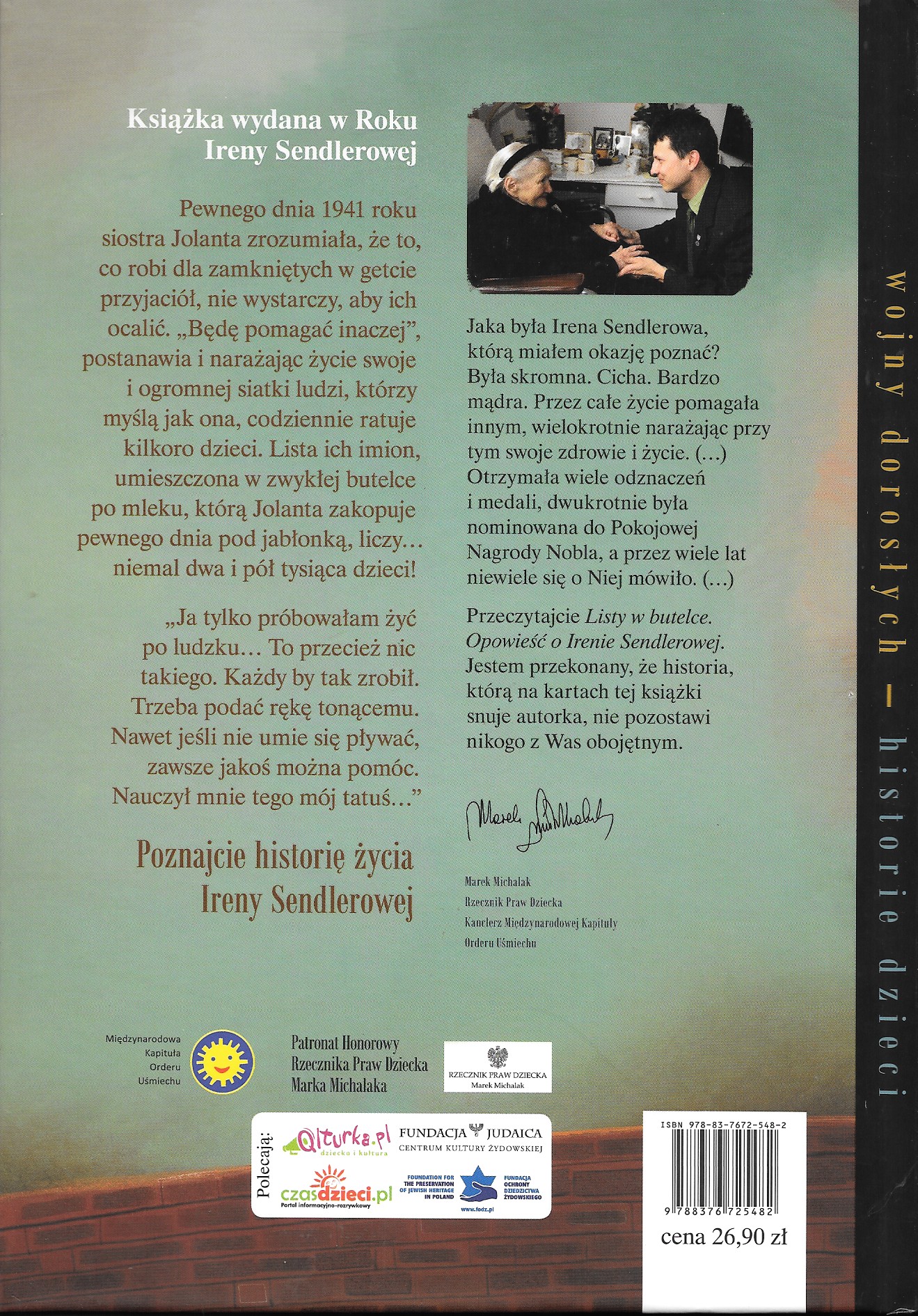 Z pomocą może przyjść książka pedagoga Anny Czerwińskiej-Rydel, autorki publikacji dla dzieci i młodzieży, wielokrotnej zdobywczyni nagród literackich. Listy w butelce, opatrzone wstępem Marka Michalaka – Rzecznika Praw Dziecka, to opowieść o życiu i działalności Sendlerowej od czasów II wojny światowej do 11 kwietnia 2007 r., kiedy to otrzymała Order Uśmiechu. Czytelnik staje się uczestnikiem opisywanych wydarzeń, poznaje codzienne, trudne życie ówczesnych ludzi, działalność bohaterki, jej pomocników, a także realia wojny. Przedstawiona historia nie zawiera drastycznych scen, ale opisuje sedno ówczesnej sytuacji dzieci w getcie. Tytuł książki nawiązuje do autentycznej sytuacji. Siostra Jolanta tworzyła listę uratowanych dzieci, którą umieściła w butelce po mleku i zakopała. Motyw listów spaja opowieść tworząc klamrę kompozycyjną. Książkę otwiera list Rzecznika Praw Dziecka, przed rozpoczęciem każdej części pojawia się cytat nawiązujący do pisania listów autorstwa Jarosława Iwaszkiewicza, Kornela Makuszyńskiego, Wiesława Myśliwskiego oraz Edwarda Stachury. Część trzecia, a zarazem ostatnia, pt. Korespondencja zawiera autentyczne listy Sendlerowej do Jana Pawła II, nauczycielki Katarzyny Ludwiniak, ucznia Szymona Płóciennika czy Kanclerza Międzynarodowej Kapituły Orderu Uśmiechu Marka Michalaka. Anna Czerwińska-Rydel przedstawiła najmłodszym czytelnikom Irenę Sendlerową jako bohaterkę oddaną drugiemu człowiekowi, współczującą, ale też ryzykującą życiem własnym i innych. Szczegółowo pokazuje etapy postępowania Jolanty w czasie wojny, a po jej zakończeniu działalność społeczną i edukacyjną. Książka może sprawić nieco trudności w odbiorze, ponieważ zawiera wiele nazwisk, dat, miejscami przyjmuje formę encyklopedyczną. Nie umniejsza to jednak jej wartości, ponieważ prezentuje postać, od której można się uczyć tolerancji, empatii oraz postaw społecznych.